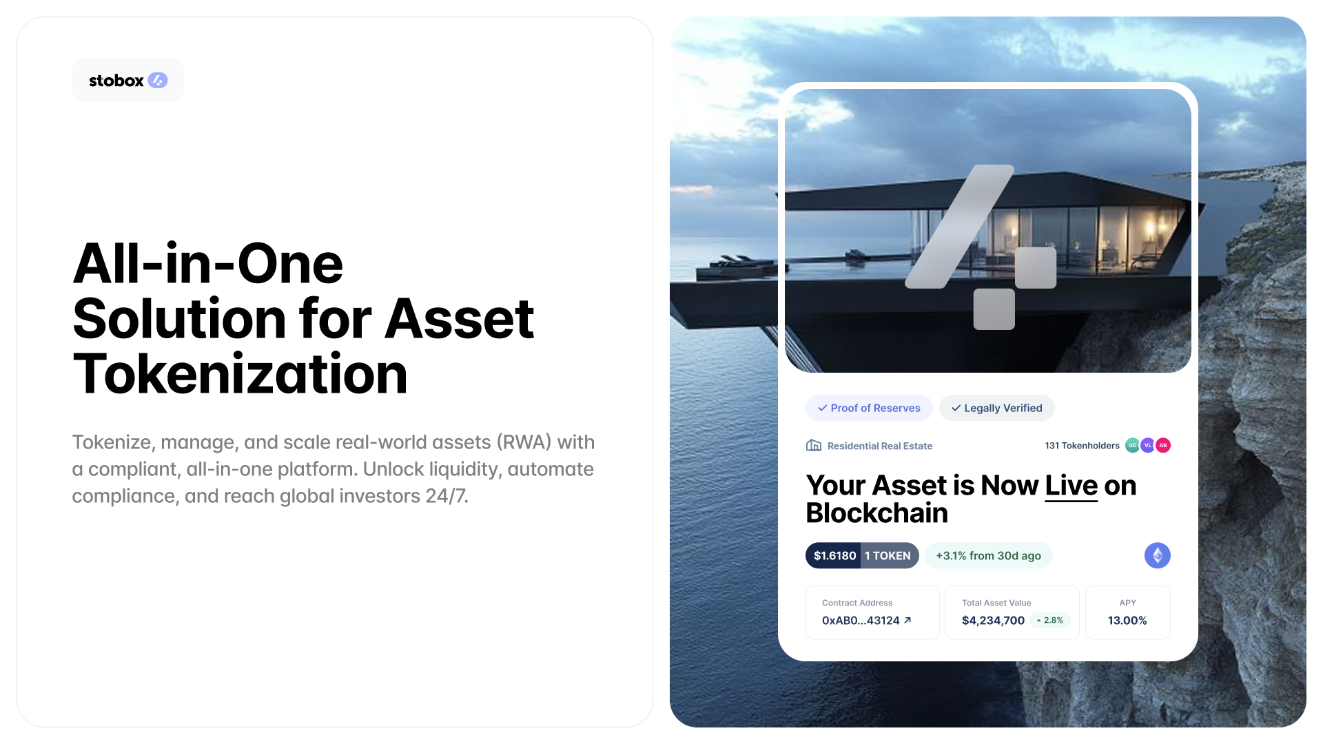 Sign-up with Stobox 4Whether you're looking to tokenize your company’s equity, real estate, debt instruments, or other real-world assets (RWAs), Stobox offers everything you need: legal structure, investor onboarding, compliance tools, secondary trading access, and most importantly – simplicity.
