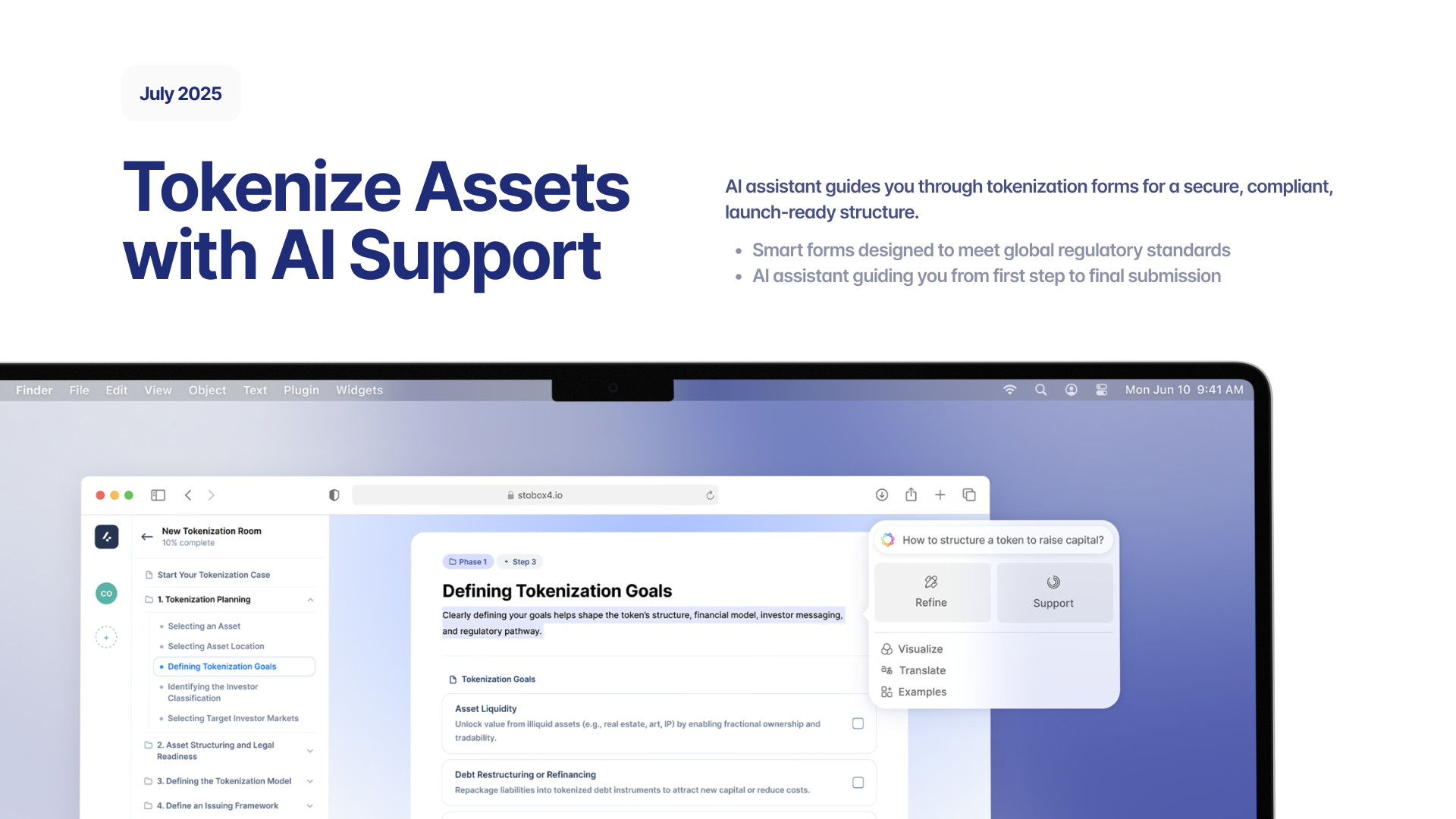 Tokenization is a legal, financial, and technical process — and Stobox 4 makes it manageable with the Stobox Tokenization Framework, a step-by-step methodology refined over 7 years and 100+ tokenization cases.