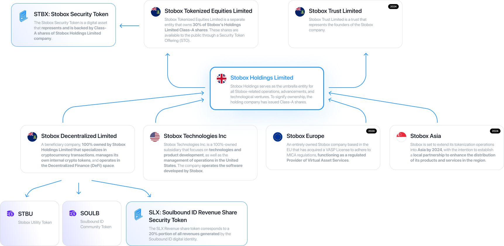 - Stobox Technologies Inc. (US): The primary entity responsible for the development and execution of our tokenization products and services. This entity is fully compliant with SEC Regulations, registered in the State of Wyoming, and has innovatively tokenized 100% of its equity via the STBX Stobox Security Token. These offerings have been made available through multiple rounds under regulations such as Reg D 506c, Reg S, and the Prospectus Directive.