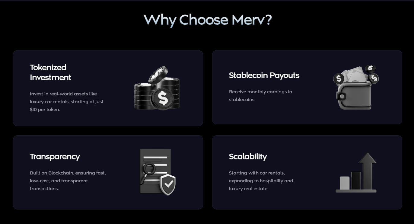 The company is raising capital through a Security Token Offering (STO) to scale operations, enhance service infrastructure, and expand market reach. Merv Capital transforms the traditional vehicle rental model into an investment opportunity with real-world impact.