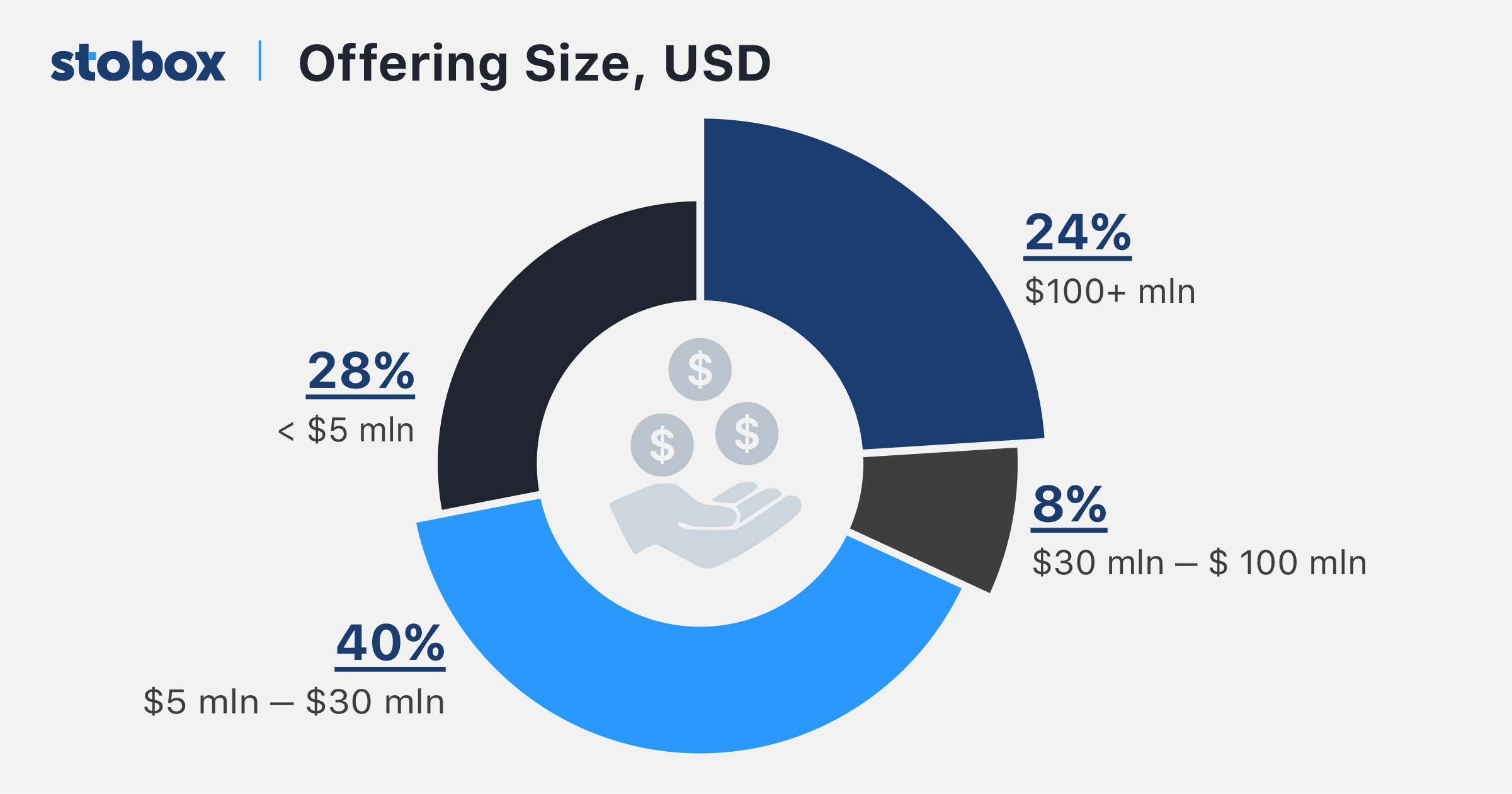 The last information block of our statistics is directly the size of the STO. Out of a sample of 60 cases, close to 30% of Stobox clients collect no more than $5 million, which is very logical given the overall development of the tokenization industry. Small-scale STOs are more preferable for small investors and therefore they are considered much more active than large tokenization projects. However, 40% of issuers raise between $5m and $30m.