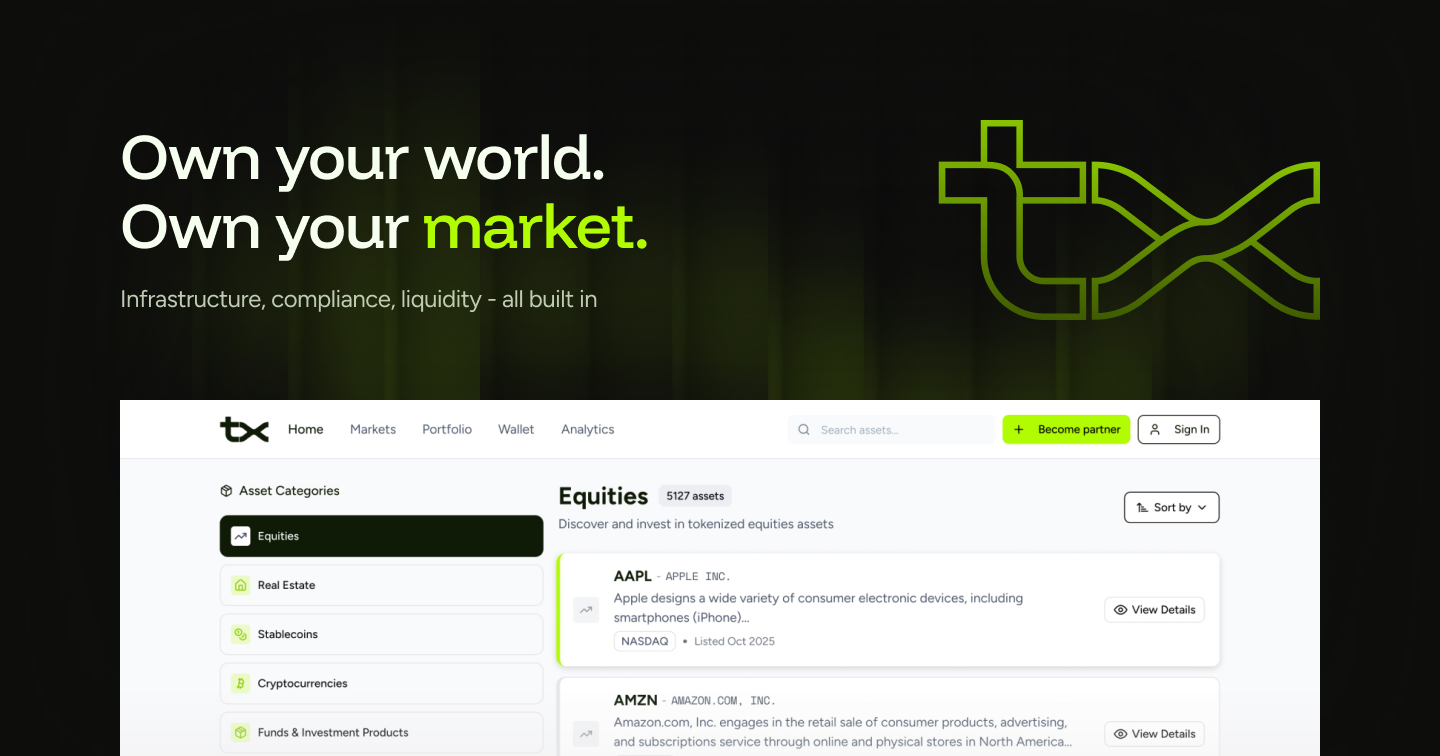 tx is the unified operating system and marketplace for real-world assets. Headquartered in the United States, tx facilitates the digital issuance, trading, and settlement of tokenized stocks, ETFs, and alternative assets through a global network of regulated partners. Running on enterprise-grade blockchain rails, tx delivers the speed, security, and compliance that capital markets require.